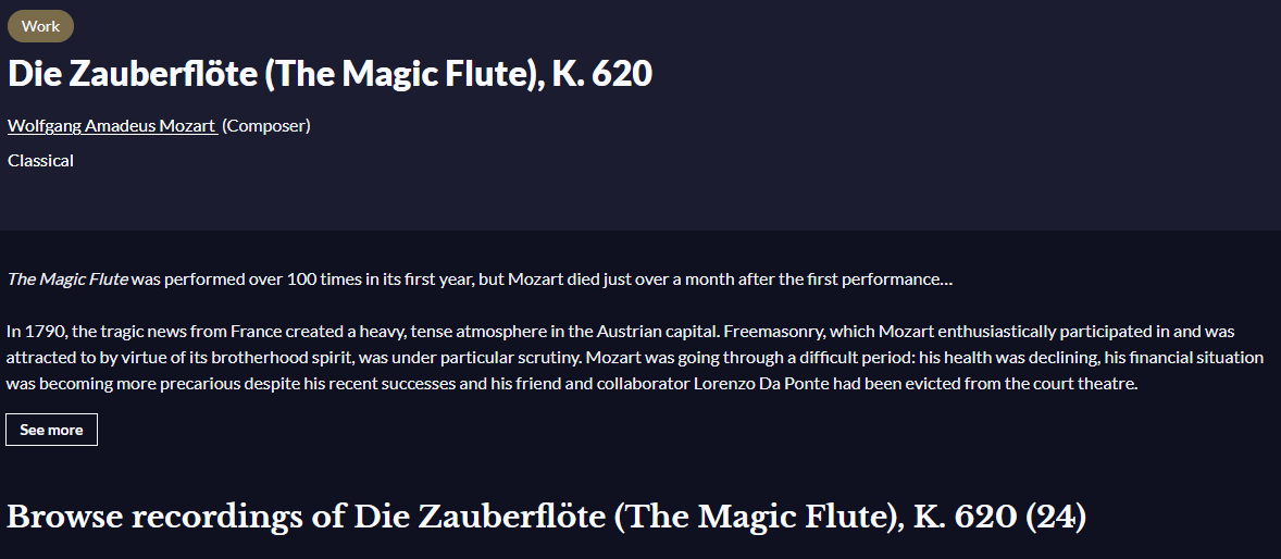Click on the musical work thumbnail, and you will arrive at the page listing all interpretations