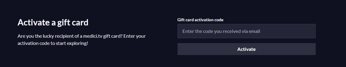 If someone has given you a medici.tv gift card, activating it is simple. Follow these steps to start enjoying your subscription: