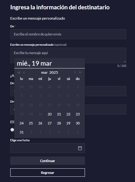 Solo necesitas seleccionar la fecha en la que deseas que la tarjeta de regalo sea enviada por correo electrónico a tu destinatario, y el sistema se asegurará de que llegue exactamente en ese momento.
