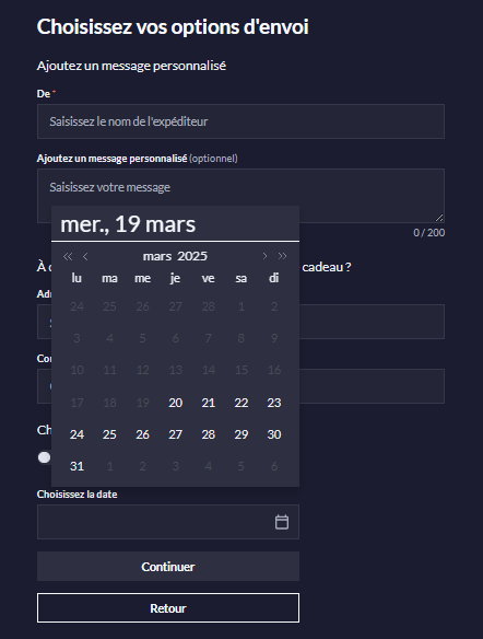 Il vous suffit de sélectionner la date à laquelle vous souhaitez que la carte cadeau soit envoyée par e-mail à votre destinataire, et le système s'assurera qu'elle arrive exactement à ce moment-là.