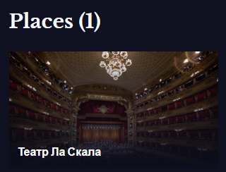 Щелкните вкладку Места или прокрутите вниз, пока не найдете раздел Места. Если вы не видите вкладку "Места" или раздел "Места", или если вы не видите место, которое вы искали при прокрутке, это означает, что у нас еще нет специальной страницы для этого концертного зала или учреждения на medici.tv.